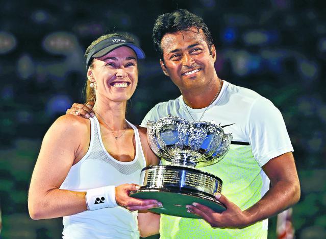 「瑞士公主」希姬絲(左)雖然已經三十四歲,但依然寶刀未老,今次澳網拍住大自己七年嘅印度名將柏斯出戰混雙,就成功奪冠。呢對七號種籽噚日決賽對住三號種籽尼斯達同文娜丹露域嘅老少配,以直落兩盤6:4、6:3砌低對手。