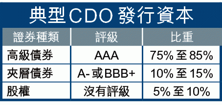 先說一點背景,一般的CDO資本結構上最少可以分為三層,最頂層是最高信貸評級的AAA,佔資本結構的70%至80%;中層是次幾級的A-或BBB+,佔15%至20%;最底層是沒有評級的股權,佔5%至10%,但回報率卻是最高的(見表)。