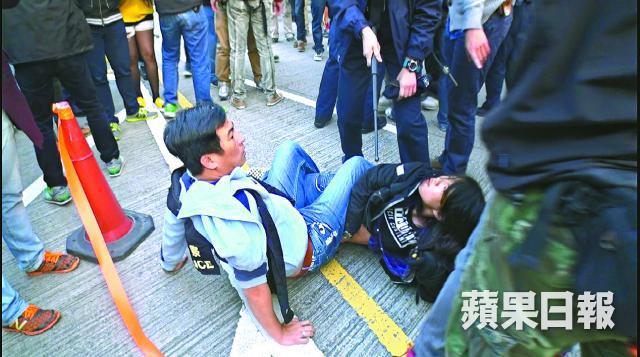 一名本土民主前線女成員疑被藍絲帶成員非禮,其後混亂間跌倒地上,有警員上前用警棍指向她,腰腳更被另一名男警用「鉸剪腳」壓着數十秒(圖)。一批熱血公民成員晚上在大埔警署外聚集,要求放人。事件中,警方拘捕三名分別十三歲、二十二歲及三十九歲男子,涉嫌襲警、妨礙警務人員執行職務、傷人、襲警致造成實際身體傷害及普通襲擊;六名警務人員及一名男子受傷。