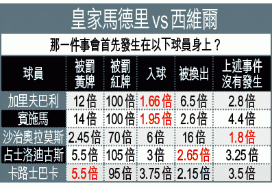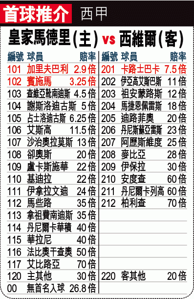 周三深夜多波睇,最有睇頭必屬「銀河艦隊」皇家馬德里。他們在西甲補賽,於巴拿比奴球場迎戰西維爾,皇馬儘管有基斯坦奴朗拿度(C朗)停賽,但其餘鋒將俱可候命,而且往績一面倒佔優,加上西維爾作客兩連敗,所以今仗必捧皇馬[-1]「主勝」。(球賽編號:星期三15;now632台明日3:45am直播)