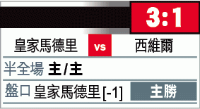 西維爾近況一般,最近在主場兩鬥愛斯賓奴,都是以一球小勝,而前兩場的作客比賽就全敗,皆以1:3不敵華倫西亞及愛斯賓奴。以西軍作客兩連敗的頹勢,今仗也凶多吉少。西維爾中後場有幾名傷兵,如雷恩斯、杜查奧斯基、基祖華克及泰莫連拿斯等。另外,為了留力鬥皇馬,西維爾上場將卡路士巴卡及迪路菲奧兩名鋒線主力放在後備,相信他們今仗會復任正選,有力攻破皇馬防線,故亦可吼中位數3.5球的入球「大」。
