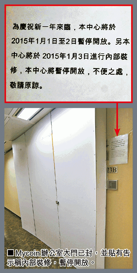 梁耀忠昨晚表示,接獲近三十名市民求助,指於比特幣交易平台Mycoin投資,近日未能套現或交易,部份苦主曾到該交易平台位於尖沙嘴的辦公室,但人去樓空,也未能聯絡公司負責人或職員。記者昨晚到Mycoin辦公室,發現大門已封,並貼有告示稱內部裝修,交易中心暫停開放。警方表示,網絡安全及科技罪案調查科暫未接獲相關報案,會密切留意事件。