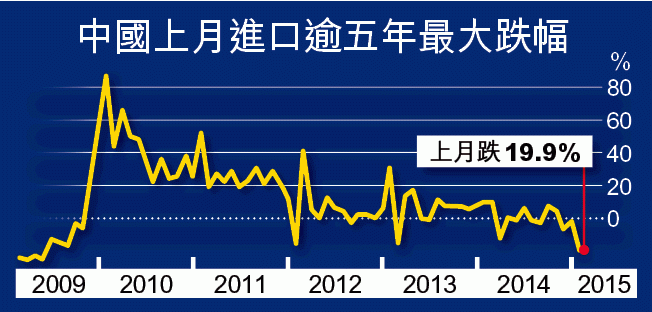 內地海關昨公佈,今年一月內地進出口總值2.09萬億元(人民幣.下同),按年減少10.8%,其中出口1.23萬億元,下降3.2%,較預期5.9%增長大為遜色;進口八千六百億元,下降19.7%,以美元計則跌19.9%,為逾五年來最大跌幅,而市場本來預期只減少3.2%;貿易順差因而擴闊近九成,達三千六百六十九億元的歷史新高。當局指數據遜色受春節因素影響,經季節調整後出口和進口的降幅分別為1.3%和14.4%,但有分析指數據反映商品價格下跌及內地需求疲弱,進一步凸顯內地經濟大降溫。