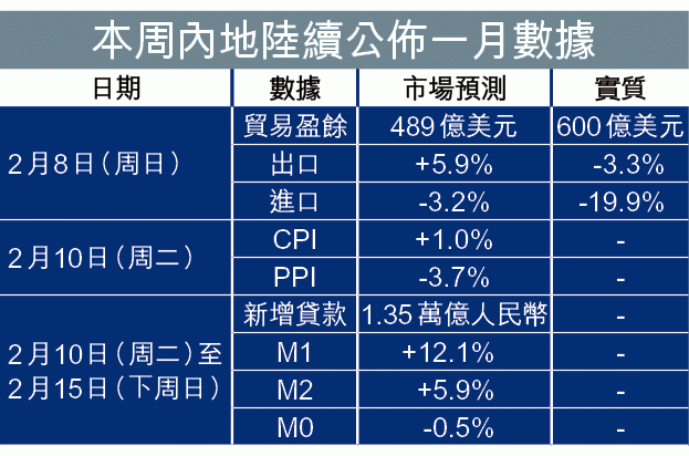 明日內地將有一月消費價格指數(CPI)、工業生產價格(PPI),本周新增貸款及貨幣供應數字亦有機會出爐,市場估計CPI及PPI分別增1%及減3.7%,新增貸款或升逾九成至1.35萬億元。耀才研究部副經理植耀輝表示,回顧內地上周急於降準的行動,早已意味本周交出的數據會強差人意,預料驚嚇數字會陸續有來。