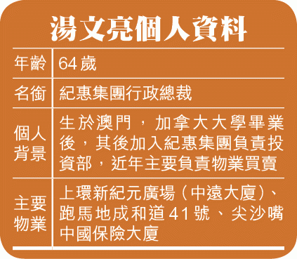 【本報訊】細價物業天天破頂,市場猜測「樓市音樂椅」何時停頓之際,「樓市大好友」兼為家族管理價值逾四百億元資產的紀惠集團行政總裁湯文亮卻突然一百八十度轉軚,昨撰文指「細價樓將會在三個月內爆煲」,爆破點是財務公司胡亂借貸,造成物業「加按又加按」,樓市隱藏危機。