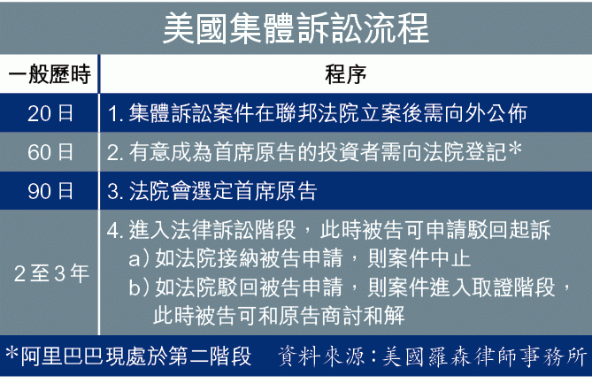 美國之所以容許阿里巴巴以不平等的合夥人制度上市,全因當地有集體訴訟機制保障投資者。基本上,在律師定下的集體訴訟期(class period)內,因投資相關股份而有損失的投資者皆可參與訴訟,且訴訟費用會由律師行支付,待勝訴後與投資者分享賠償金。