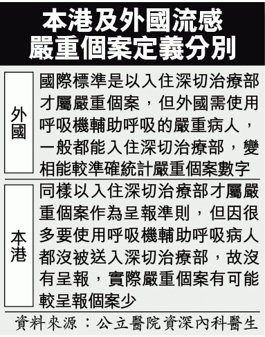 該資深內科醫生指,國際標準是入住深切治療部才屬嚴重流感個案,但外國一般使用呼吸機的嚴重病人都會入住深切治療部,統計嚴重個案較準確。醫管局同樣以入住深切治療部作為嚴重流感個案定義,但因公院深切治療部病床不足,部份病人病情非常嚴重,「有深切治療部醫生睇過覺得醫唔到,就冇送個病人入去」。
