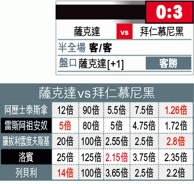 薩克達於歐洲賽從未試過與拜仁交手,惟歷來與德甲隊十四戰,五勝四和五負,其中主場兩勝三和一負。然而,拜仁「弗」到漏油,加上陣中眾攻擊主力又處於佳態,故有力作客贏波,必捧[-1]「客勝」。文:青蛙仔