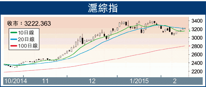 滬綜指上周五重越3200後,昨一度回落至3200之下即見支持,以陽燭重越二十日線(3221),連續六日出現陽燭,MACD險出現雙熊訊號之勢,熊差距開始收窄。上周滬指乍現雙頂不利訊號之際,連續回升並向上拋離雙頂頸線,化解雙頂風險,若馬年最後一個交易日能守於二十日線之上,春節假期復市後有條件再上,上方阻力仍是今年高位3400水平。