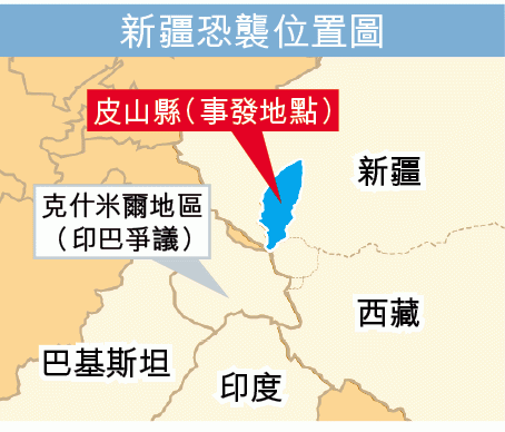 皮山縣位於新疆南部,與中亞、南亞多國相鄰,九成居民是維族,二○○九年烏魯木齊七五事件,參與砍殺漢人的維人不少來自皮山縣。二○一一年,十五名維人欲經皮山出境參加「聖戰」時迷路,脅持兩牧民做人質,被軍警圍殲七死八傷,警一死一傷。