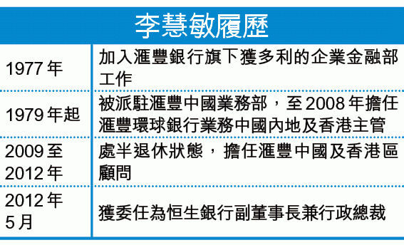 現年六十二歲的李慧敏,三年前獲恒生董事會委任,接替退休的梁高美懿,任該行副董事長兼行政總裁;李氏的董事任命為期三年,由二○一二年五月起,至今年五月止。