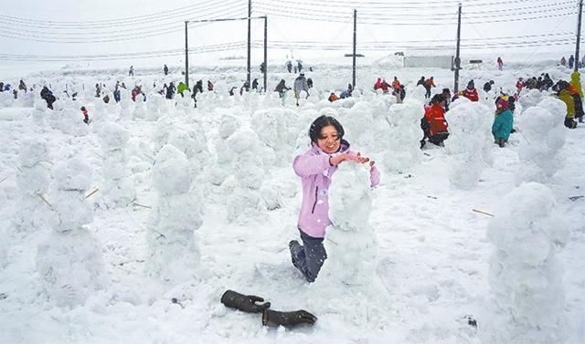 日本長野縣飯山市居民成功在一小時內堆砌一千五百八十五個雪人,打破健力士世界紀錄。前天是「飯山雪祭」最後一天,當地又重又濕的積雪有利六百三十名參加者大顯身手,老老嫩嫩先滾出雪球堆成身軀(小圖),再插上木筷子作雙手及點上眼睛(上圖),還要達到指定高度才算合格雪人,最終近一千八百個製成品中,有一千五百八十五個達標,每個高約一米,打破二○一一年在美國創下的一千二百七十九個的紀錄,健力士世界紀錄大會已確認結果。日本《信濃每日新聞》