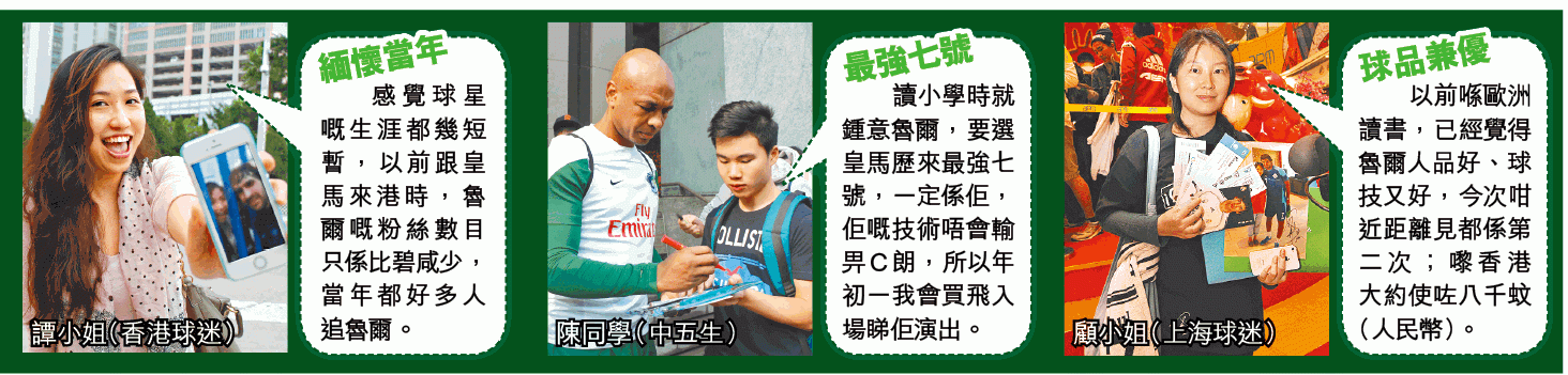 任職工程經理的麥先生坦言,自一九九六年起已開始留意魯爾,十二年前未有追星,所以昨晨一早九時半便來到apm守候偶像︰「擔心自己一個未能把所有球衣給偶像簽名,所以找來表哥幫手。」結果皇天不負有心人,排頭位的他終成功獲得魯爾簽名,兼與偶像合照。