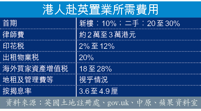 投資外地樓市如隔山買牛,有多個注意事項。中原地產項目部(中國及海外物業)營業董事許大衛指,香港人多數買一手英國樓花,揀好心水樓盤後,可向發展商落訂(Booking Fee)留位,到發展商確認單位可買時,買家最少要付一成首期,電滙至英國律師樓,便代表買家進行交易,成事後雙方交換買賣合約代表正式買下樓花,上述需時約兩至四周,之後便是等入伙,一般兩至三年。到交樓前兩個月,便要申請按揭,發展商一般有相熟銀行,如中國銀行英國分行,借英鎊上會,時間視乎銀行及交文件速度。到收樓日才需要親身到英國,但亦可找委託人代辦;銀行按揭息率普遍約3.6至4.9厘。