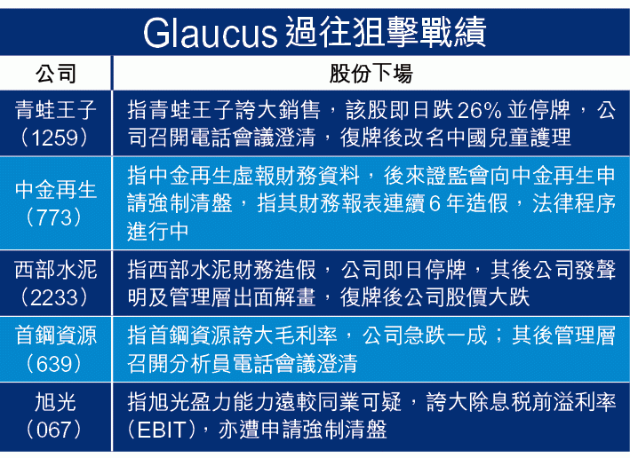 Glaucus戰績彪炳,成名作是沽空中金再生,令證監會首次引用《證券期貨條例》212條,勒令叫停股份交易,中金上月同意被清盤,另外「中投三寶」之一旭光早前亦遭申請清盤。