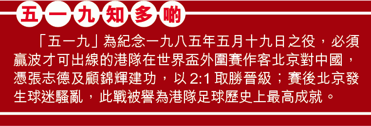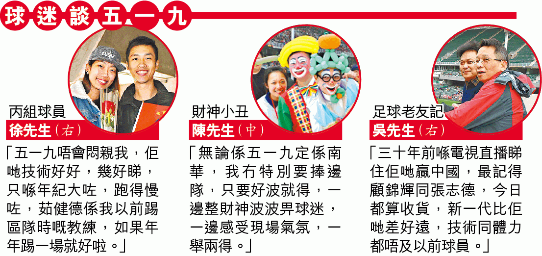 由郭家明領軍的「五一九」,昨打頭陣大戰由黃文偉帶領的南華名人隊,場面熱鬧,就連叱咤六十年代的球星「阿香」張子岱,也是座上客。兩軍陣容星光熠熠,但開賽初段還是年紀較輕的南華名人隊較有優勢,憑李健和先開紀錄,而在十四分鐘更重現了經典的「單刀橫傳」場面,和哥右路傳中予「死火倫」歐偉倫,後者單刀面對門將居然未有攻門,反而頭槌二傳,最後被對手偷走皮球。幸好和哥於完半場前再入一粒,助南華領先2:0。易邊後,南華再由黃澄輝把優勢拉開到3:0,但「五一九」之後連入三球,「快艇山」施維山及「阿仔」劉榮業先後各建一功,追近至2:3。至完場前四分鐘,兩位入球功臣再合作炮製了一個入球,阿仔勁射被撲出,快艇山門前執雞終扳平3:3完場。兩軍賽後繞場一周,更獲現場球迷起立拍掌致敬。