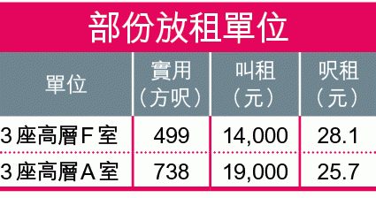 利嘉閣劉浩勤指,峻瀅租盤由高峯期逾三百伙,減至約三十伙,租金入場費升至約一萬四千元,較低位反彈逾四成。