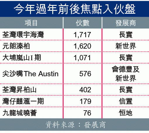 發展商積極散貨,不少項目都會於過年前後陸續收樓,保守估計單是今季已有近六千伙入伙新盤,當中不乏提供逾千伙的大型項目,包括長實(001)荃灣環宇海灣、大埔嵐山I期、新世界(017)元朗溱柏以及同系與會德豐(020)合作的尖沙嘴The Austin。