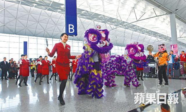 香港國際機場昨晨洋溢新年氣氛,國泰航空派出一批空姐跳舞,並加入舞獅隊沿途助興。永安、康泰及東瀛遊等旅行社高層亦到場向出團的員工派發利是,並連同財神打扮的職員向團友送贈小禮物拜年,「恭喜發財」祝福語充斥整個登機大堂。