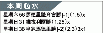 羊年先祝各位讀者身體健康,萬事勝意。上周此欄獲幸運之神眷顧,成功過關,希望今周可以再下一城。衞冕的馬體會(圖)上場作客不敵切爾達,為保爭標希望,今日對艾美利亞不容有失,而翻查該隊近季甚少連敗,此戰有條件重開勝門。