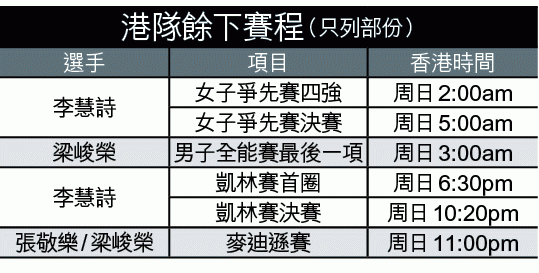 由於五百米計時賽並非奧運項目,Sarah參戰主因是為即將舉行的爭先賽及凱林賽備戰,所以今次沒有獎牌,無損她出戰這兩個奧運項目的信心。事實上,爭先賽已於香港時間十時展開的資格賽,她得第十名,次圈對德國華達。決賽在今日舉行,列強包括中國的郭爽、鍾天使、德國禾高及澳洲美雅絲等。Sarah在周日最後一天比賽,將出戰凱林賽,預料競爭相當激烈。