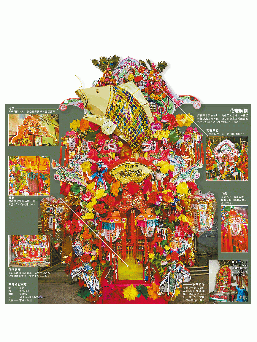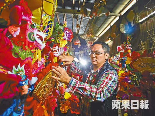 錦田鄉不少花牌由冒卓祺師傅主理。冒師傅不是錦田人,出身古洞,十九歲入行學習紮麒麟,又師從紮作界名店中環金玉樓老師傅關多,懂舞獅舞麒麟,本身既是紮作師,又是古洞義和堂花炮會的主席,一九九七年創立紮作店「祺麟店」。中國傳統節日眾多,每個月某些村都有活動,冒師傅的生活作息,便跟着節慶走,「從來不覺得厭倦,你看年年都紮炮,賀誕都按傳統進行儀式,但我們會遇到不同的人啊。」節慶是一個重要的社交場合,面對面交流練就的技巧,是上一代人成功的關鍵,「老一輩師傅不會直接傳授技法,我喜歡問到底,慢慢從旁觀察,老師傅知道我有誠意學習,慢慢便會分享竅門。」