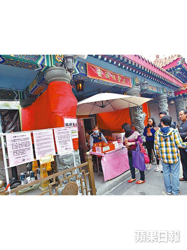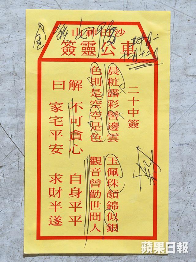 訪問當日是平日,但排隊解籤的善信眾多,三至四個檔攤,各有兩三人等候,平均每人要等約十五分鐘。我等的檔攤特別慢,足足等了四十五分鐘,在漫長等候時間裏,打聽到解籤師傅不少背景資料,「我中學畢業,做咗十八年保險,我出一張單只需要五分鐘,其他人要一星期。當時保險人工好低,我一九八三年離職,每月先得八千六百蚊人工。我做解籤呢行做咗三十幾年,我鍾意呢行冇佣金,做又高興,唔做又高興。」師傅一副伶牙俐齒,有未婚女客人說難覓對象,師傅逗趣說:「再唔得搵我老竇,再唔得搵我個仔。」把口滑過油,哄得客人貼貼服服。