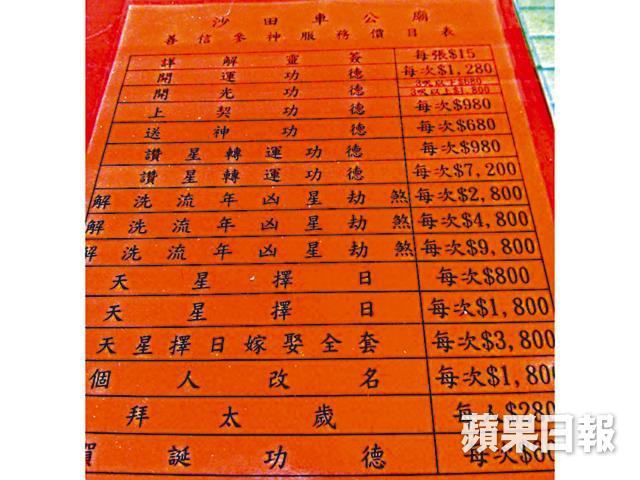 師傅枱頭有一張價目表,清楚列明不同服務收費,最基本的解籤服務收十五元,但據我觀察,上兩位客人均消費了三百二十五元,委託師傅求籤外,還聽從師傅建議,向車公「品埋願望」。解籤的時候,師傅先問八字:「睇你個八字,我乜都睇晒㗎喇。」有位住旺角唐樓、兒子三十歲的譚太,今年想申請兩人公屋,特意來車公廟求籤。師傅看了八字後,用肯定語氣說:「你個仔好大聲㗎,支籤係上籤,但唔代表係好嘅,佢今年犯太歲,有冇瞌眼瞓,冇記性先?有就即係唔好。你可以求吓神,消災解難做功德,全部公司價錢,我都冇錢賺㗎。」