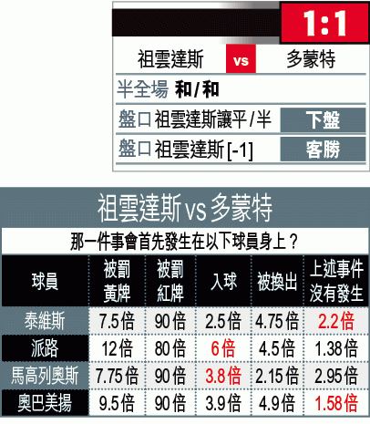 周二另一場歐聯十六強首回合賽事戲碼亦不錯,由意甲冠軍祖雲達斯,主場迎戰德甲的多蒙特,兩軍曾於一九九七年決賽碰頭,多蒙特當時大勝封王,現喜見「蜜蜂兵團」回勇,祖記在歐聯的戰績則反覆,博客軍不敗,受讓平/半取下盤。(球賽編號:星期二10;有線62及202台明日3:45am直播)