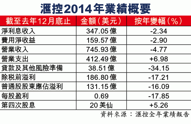 穩健的亞洲業務難以扭轉滙控頹勢,集團二○一四年業績令人大跌眼鏡,稅前盈利僅一百八十六億八千萬(美元.下同;約一千四百五十七億港元),按年跌17.21%。面對低收入及潛在罰款及高營運開支,滙控拉倒早前訂下的三年策略目標,下調股東權益回報率(ROE)門檻至10%。