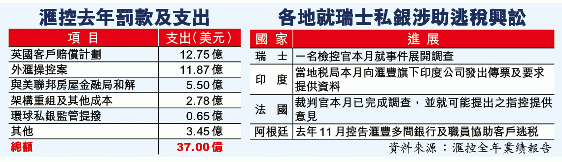 去年度滙控為外滙操控調查罰款、英國客戶賠償計劃及其他訴訟,合共支出達三十七億元(近二百九十億港元)。業績透露,就外滙操控案及向美國客戶出售債務產品,今年已預留額外達十一億元賠償開支。