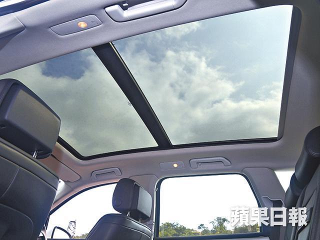 記者不太喜歡坐在鐵盒子裏的感覺,故對開篷車、大天窗格外加分。甫走上Touareg,首先伸手旋動天窗掣,全電控天窗徐徐打開。特大天幕玻璃面積足足達到1,452×990mm,橫跨前後座,和暖陽光灑遍整個車廂,很享受這種「開篷SUV」的極開揚感覺。五天長測期間,一直沒再關上片刻。