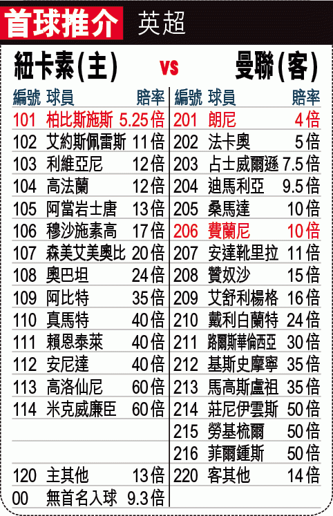 至於主隊紐卡素近期戰績有改善,上周六英超在主場以1:0擊敗阿士東維拉,最近五場聯賽僅一次落敗。紐卡素在今季只曾三次於主場落敗,利物浦及榜首車路士亦要敗走;今仗面對曼聯,有取分本錢,受讓半/一,不妨追捧下盤。