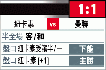 曼聯在上輪英超重上勝軌,於主場擊敗新特蘭,周三聯賽作客出戰紐卡素,要再下一城卻未必會如願。紅魔近斯作客表現平平,造訪聖占士公園難以全取三分之餘,預計入球數字亦不多。紐卡素主場受讓半/一,捧下盤及入球「細」。(球賽編號:星期三16;now624台明日3:45am直播)