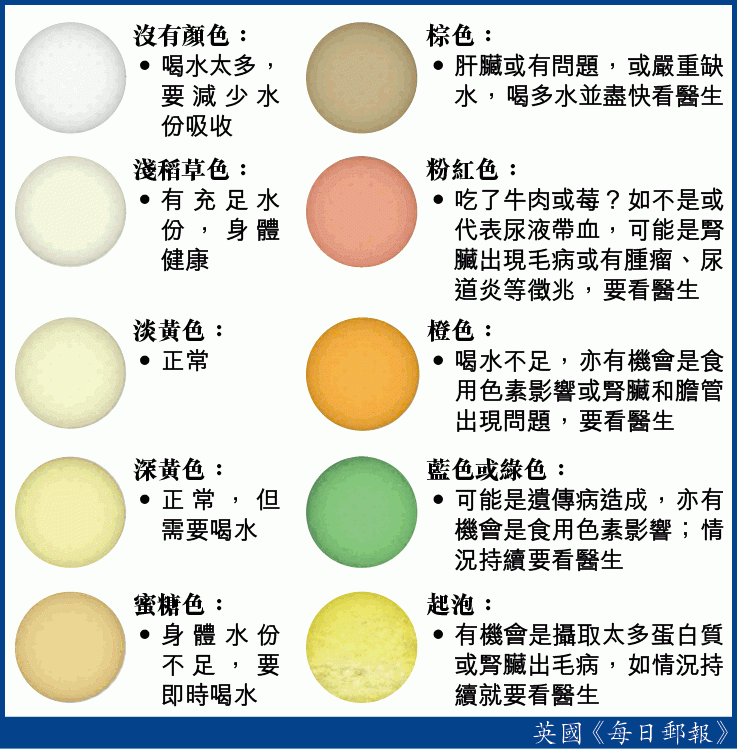 尿液顏色能透視健康!英國醫生斯蒂爾(Chris Steele)鼓勵大家檢查自己的尿液顏色以檢視身體機能狀況,但提醒要在如廁中途留意尿液顏色,而非待尿液流進馬桶才作顏色對比。