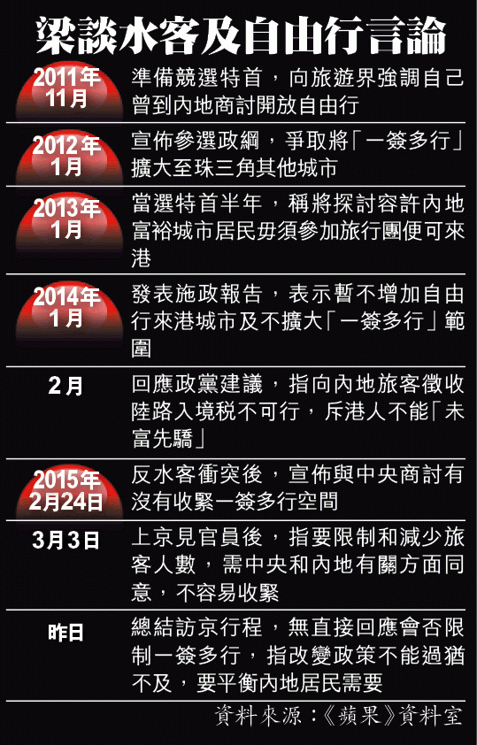 梁振英昨傍晚在北京會見記者,總結列席兩會四日行程,談及自由行政策時,僅稱中央政府會繼續協調各部門和地方政府,強調政策變化不能過猶不及,「一簽多行個問題,我哋係繼續探討。主要係點樣一方面平衡好內地居民來香港旅遊嘅需要,呢個政策下俾佢嘅權利,同時唔影響香港市民生活。亦要考慮呢個政策若有任何調整,唔會造成人數大幅減少,因為會影響香港整體經濟,尤其係鄰近深圳嘅地區嘅經濟同地區就業。」