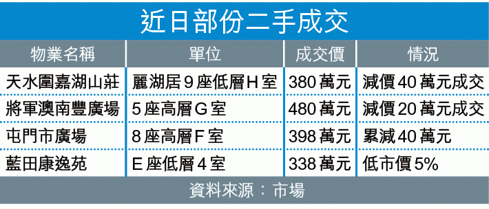 【本報訊】政府收緊按揭,一手提供二按盡吸市場購買力,二手業主惟有減價沽貨,其中天水圍嘉湖山莊一個三房單位,業主原本叫價企硬,辣招後態度軟化,減價近一成沽出單位。