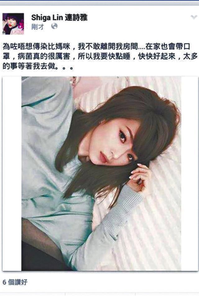 很多藝人鍾意selfie,連詩雅亦不例外,前日生病仍不忘在床上自照,連詩雅楚楚可憐在facebook留言:「為咗唔想傳染畀媽咪,我不敢離開我房間……出房門在家也會帶(戴)口罩,病菌真的很厲害,所以我要快點準備睡,快快好起來,太多的事等着我去做……」不過,連詩雅的病容樣似乎過份精靈,眼線、眼睫毛、姻脂及紅卜卜的嘴唇一應俱全,不少網友質疑她為何患病都化濃妝,連專欄作家健吾更cap圖寸嘴說:「飲飲吓水噴到成個mon都係。祝早日康復啦吓。」但其實連詩雅前日在荃灣公園出席活動,當時僅穿短袖衫,可能因為天氣太冷所致,估計她因太攰、太不舒服,所以未落妝便上床休息。