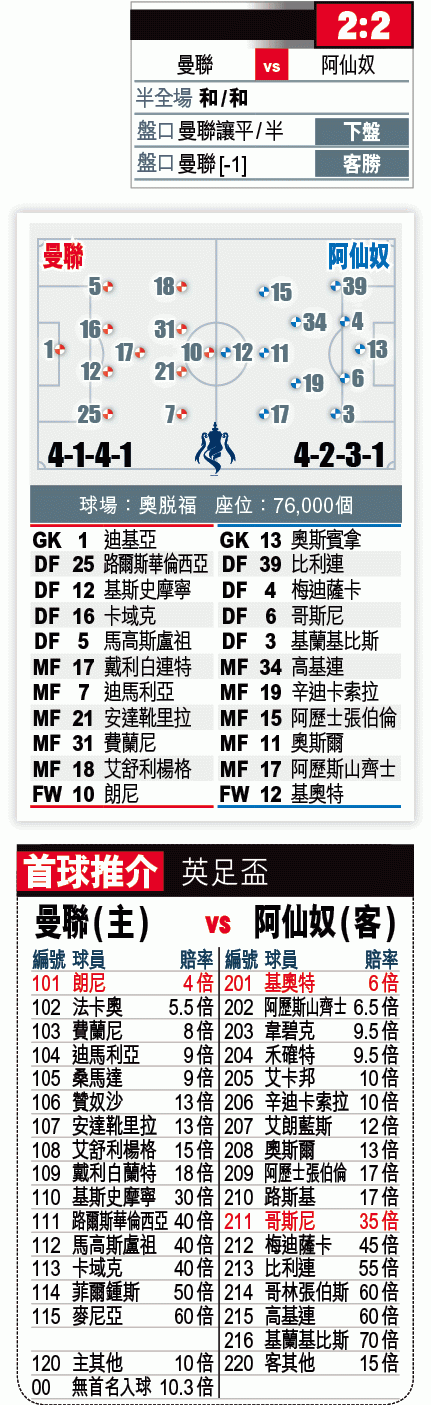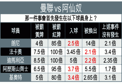 曼聯近年於奧脫福剋住阿仙奴,對上六次交手全勝,而且今季於主場比賽表現亦對辦,十五戰取得十二勝一和兩負,故周一迎阿仙奴被睇高半線亦合情合理。無疑他們星光熠熠,惟中前場問題多多,例如迪馬利亞及法卡奧未能踢出身價波,桑馬達不受重用,尹佩斯則因足踝受傷缺陣;而朗尼雖然於今季為曼聯入了十一球,惟整體而言未算太突出,更被其他隊伍的英格蘭後輩如哈利卡尼、查理柯士甸、丹尼艾格斯及比拉希奴等比下去。