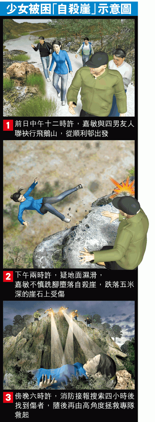 前日中午十二時許,嘉敏與四名男友人聯袂往飛鵝山行山,在順利邨集合後出發。至下午二時許,因天氣潮濕地面濕滑,嘉敏不慎跣腳墮落極度陡峭的自殺崖,在九死一生之際。她跌落五米深一塊三米闊的崖石止住跌勢,不致粉身碎骨,其鼻骨、左手及雙腳骨折,倒在崖石上痛苦呻吟。