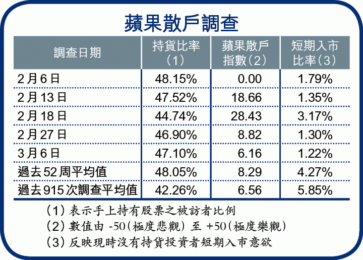 另本報調查顯示散戶樂觀情緒維持,散戶指標由前周8.82降至6.16;有貨在手散戶比例則由46.9%升至47.1%;短期有意入市者比例降至1.22%。