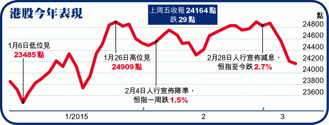 人民銀行上月底宣佈再減息後,中港股上周卻交不出成績,恒指全周報跌659點或2.7%,報24164點,H指更意外跑輸跌4.8%或578點,報11606點;滬綜指及深成指全周亦分別跌2.1%及3.1%。在美股拖累下,港股ADR上周五跌逾300點,滙控(005)ADR較港跌逾2%,其餘重磅股如中移動(941)及國壽(2628)ADR亦至少有1%跌幅,倘港股今跟隨ADR走勢,預料恒指或低開304點,至23800點水平。