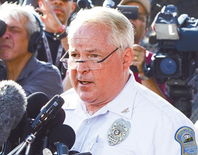 美國司法部就黑人青年布朗被殺,狠批密蘇里州弗格森市警隊歧視黑人後,警察局長傑克遜(下圖左)前日宣佈辭職。約一百五十名市民晚上在警察總部門外示威,與防暴警察暴發衝突,混亂中兩名警員被槍擊受傷。