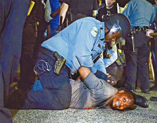 示威氣氛起初大致和平,但至昨日凌晨,現場傳出槍聲,有人高聲尖叫:「他們射中了警察!」部份示威者倒在地上,有人爭相走避。包括二十多名防暴隊在內的大批警員趕到現場,包圍着警察局,至少兩人被捕(下圖右),但開槍者仍然在逃。聖路易斯縣警察局長貝爾馬表示,受傷的是四十一歲及三十二歲的警員,分別肩膀及臉部中槍,二人意識清醒。