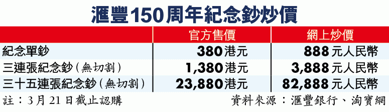 【本報訊】滙豐一百五十周年紀念鈔雖然仍未截止認購,但在內地不少網站已見到有網民炒賣。其中淘寶網湧現大量滙豐紀念鈔「貨品」,原價港幣三百八十元的紀念單鈔,炒高近兩倍至八百八十八元人民幣;最貴的三十五連張紀念鈔,原價二萬三千八百八十元,更炒高至八萬二千八百八十八元人民幣,炒高了逾三倍。