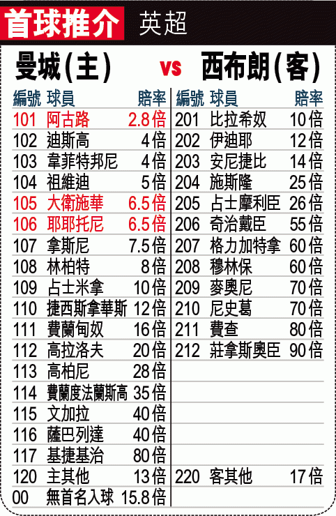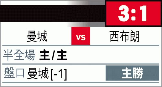 衞冕曼城目前在英超的形勢可說是「前無去路,後有追兵」,被榜首車路士拋離之餘,三至五位的球隊又來勢洶洶,因此「藍月」為保住些微奪冠希望兼保住下屆歐聯席位,在周六聯賽早場迎西布朗時必搏;適逢西布朗未能「夫添」,一於直取曼城[-1]「主勝」。