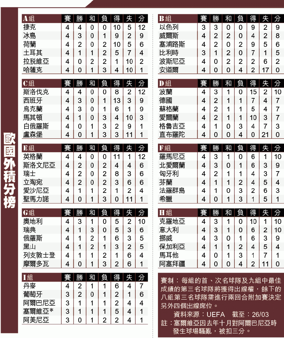 要留意,立陶宛後防不乏外流球員,其中門將艾羅斯基斯、隊長基贊斯卡斯及後衞沙利奧卡斯,就分別效力布加勒斯特星隊、海法夏普爾及格拉斯哥流浪,故預期他們會於溫布萊踢防守足球,務求把失球數字減至最低。