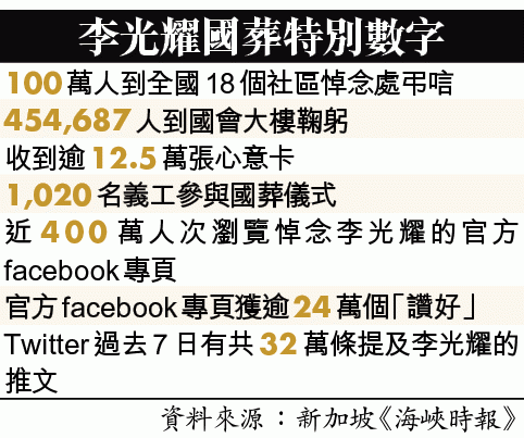 新加坡建國總理李光耀的國葬儀式,昨午2時在新加坡國立大學文化中心舉行,除了李光耀親友和新加坡各界人士外,還有來自23個國家的政要出席。儀式上,李光耀兩子及另外8人致悼辭,向新加坡國父致以最深切敬意。