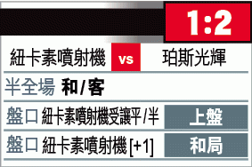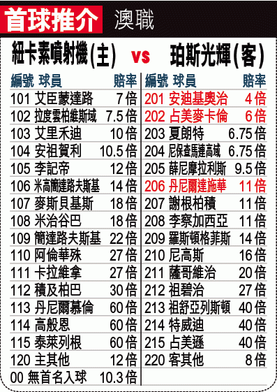 雖然澳職沒有降班制,故目前以23戰得14分、敬陪末席的紐卡素噴射機並不愁降班,不過,全隊上下都不想包尾過終點,故今迎光輝時,料不會放軟手腳。可惜噴射機近12仗僅一勝,攻力啞火是該隊今季的致命傷,加上又缺占士域基利及祖舒巴里斯等,就算今役有安祖賀利踢罷國際賽歸隊,而且主場受讓,亦不宜高估。