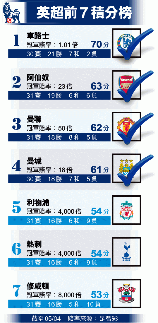 英超在復活節檔期基本已決出前四!車路士上周六於夜場靠福將雷米入波,以2:1險勝來訪的史篤城,繼續以七分領放兼打少一場;至於分別踢早場及中間場的阿仙奴及曼聯亦齊齊贏波,進一步鞏固前四位置,但紅軍敗走兵工廠後,爭入前四的機會變得相當渺茫。